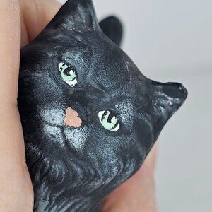 Vintage Black Cat Figurine Signed Cindy Hand Painted Green Eyes *Flaws*