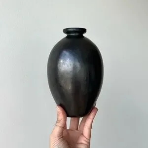 Sleek black ceramic vase with a smooth finish. Simple rounded silhouette. Small narrow neck for single stems. Timeless minimalist design. Versatile for modern or classic decor.