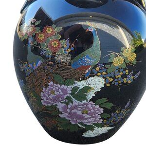 Add timeless sophistication to your home with this vintage Japanese black ceramic vase, beautifully hand-painted with a striking peacock and floral motif. Accented in shimmering gold, this vase features a glossy finish and a unique double-handled design, making it both functional and decorative. Its rounded body and flared rim highlight the detailed artwork, while the bold black background creates a dramatic contrast against the vibrant colors. A perfect centerpiece or collectible, this vase embodies vintage artistry and elegance.