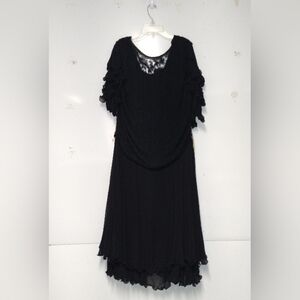 Vintage Black Chiffon Dress with Gold Sequin & Beaded Bodice – Holiday Glam Cocktail Dress - Step into timeless elegance with this vintage-inspired black chiffon cocktail dress featuring a dazzling gold sequin and beaded bodice with fringe accents. The short ruffle sleeves and flowing layered skirt add romance and sophistication. Perfect for cocktail parties, weddings, holiday gatherings, or special occasions.