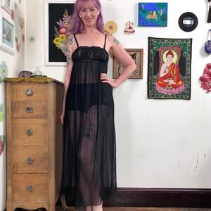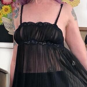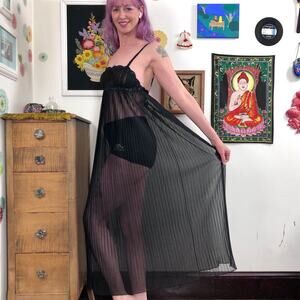 Vintage Black Chiffon Nightgown, Sheer Accordion Pleat Nightie Sz Small