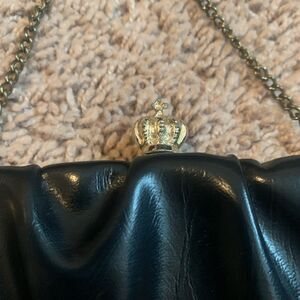 Black patent leather shoulder bag purse with a snap closure, a small gold chain for a handle. Unique style snap closure: small decorative crown.