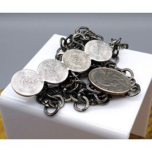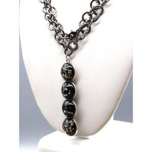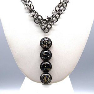 Vintage Black Confetti Lucite Pendant Necklace, Gunmetal Circle Links Chain with Four Cabochon Drop Bar in Silver Tone