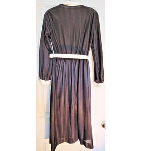 Vintage Handmade Midi Dress with Belt, Black Shiny Stripe, Cream Sleeves and Shirt Bow Collar, Long Sleeve, Button Front, Sheer