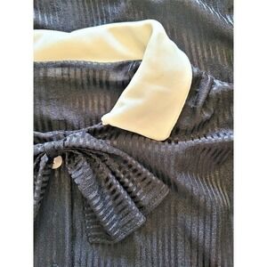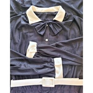 Vintage Handmade Midi Dress with Belt, Black Shiny Stripe, Cream Sleeves and Shirt Bow Collar, Long Sleeve, Button Front, Sheer