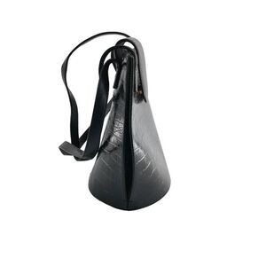 This vintage black croc-embossed leather bag is a refined statement piece, blending structured sophistication with bold texture. The sculptural bucket-style silhouette features a rounded base, adding dimension while maintaining functionality. The embossed leather exterior elevates its luxurious appeal, making it an effortless accessory for both everyday wear and formal occasions.