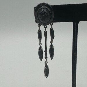 Elegant vintage black dangle earrings featuring an intricate carved design. Perfect for adding a statement touch to any outfit, these earrings offer both style and sophistication. Ideal for special occasions or enhancing your everyday look.