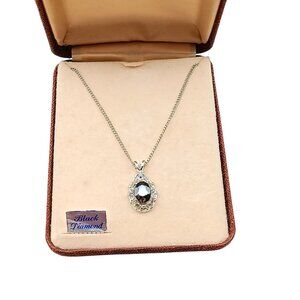 This vintage necklace showcases a striking black diamond pendant, elegantly set in a timeless design, perfect for collectors of unique heirloom jewelry. The original box enhances its nostalgic charm, making it an exceptional addition to any jewelry collection.