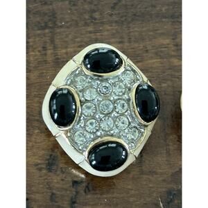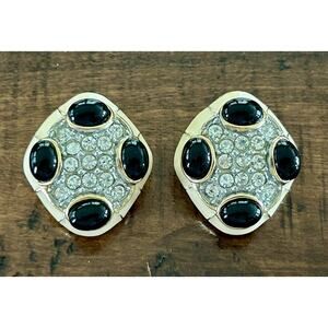 Vintage Black Enamel Cabochon Rhinestone Chunky Clip-On Earrings 1990s