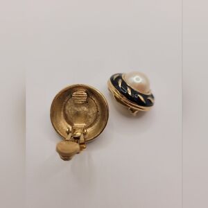 These vintage clip-on earrings feature a black enamel design with faux pearls. The clip-on closure makes them easy to wear without needing pierced ears. The elegant black color and classic clip style add a touch of sophistication to any outfit.