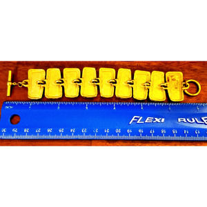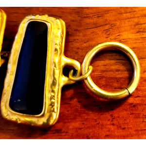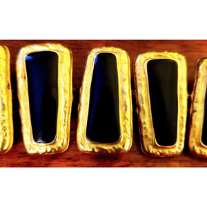 This vintage black and gold-tone 9-section bracelet features a unique trapezoid shape for the main stone. The linked sectional design is secured with a T-Bar closure for a secure fit. The wrap style and bar setting make this bracelet a stylish and versatile accessory for any occasion. The base metal is gold-tone and the main stone color is black. This bracelet is perfect for jewelry collectors and vintage lovers alike.