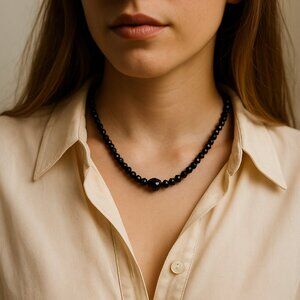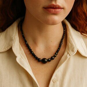 This vintage 17-inch necklace features beautiful faceted black glass beads in graduated sizes, catching the light with every movement. The design showcases a bold central bead flanked by smaller faceted beads, creating a striking yet versatile look. Finished with a classic barrel clasp, this piece reflects the timeless craftsmanship of mid-century fashion jewelry.