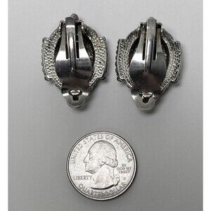 Vintage black oval faceted stone & silver-tone clip-on earrings. The oval stones seem to be glass or crystal, & the setting has a rope type frame design. These earrings have a very classic look.