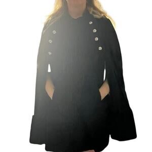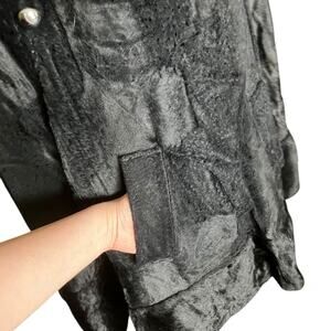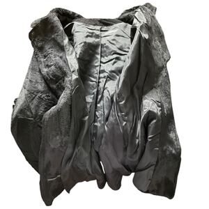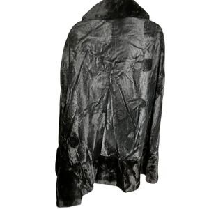 Gorgeous vintage black faux fur cape coat featuring a dramatic swing silhouette, silver statement buttons, and hidden pockets. Fully lined with a smooth satin interior for comfort and structure. The faux fur is delicately aged, giving it an authentic vintage texture and patina. Best suited for special occasions or display due to its fragile nature. Perfect for collectors, costume styling, or a glamorous winter night out.