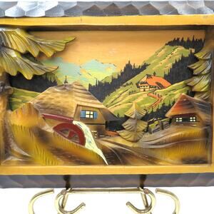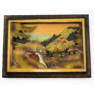 Vintage Black Forest Hand Carved 3D Wood Wall Plaque Alpine Chalet Scene Germany