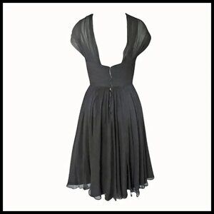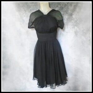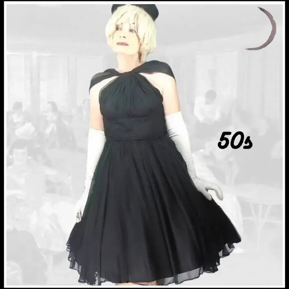 Vintage Black Formal Fit Flare Cocktail Dress, 50s New Look Chiffon Halter