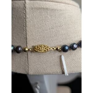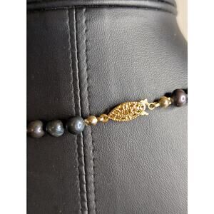 Vintage Black Freshwater Pearl Hand-Knotted Slightly Graduated 18" Necklace. Cord is dark like color of pearls. Clasp is gold tone, not marked, and not magnetic. Pearls range in size from approximately 6-8mm. Pre-owned, these pearls are in excellent vintage condition.