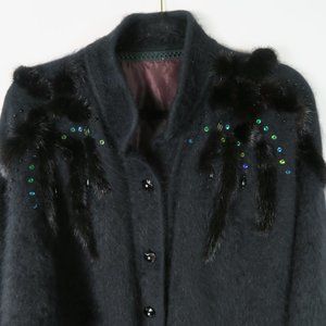 Vintage Black Fuzzy Button Up Cardigan M/L Japanese Sequin Fur Bead Embellished
