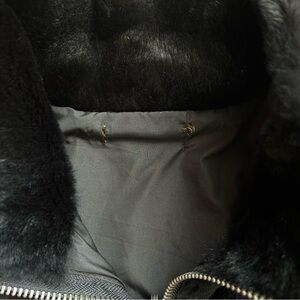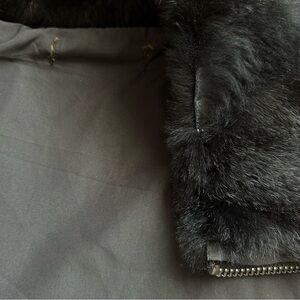 This vintage black genuine fur (Rabbit or Nutria) zipper vest features a super soft hand feel with a zip closure, stand collar, side pockets, and a full lining. I believe this piece could be attached to a coat as a cozy lining since it has little button loops on the inside and the zipper is reversible but it looks great on it's own and you could wear it with the fur inside if you wished.