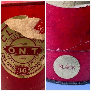 Old-school industrial thread with original packaging still intact. O.N.T. glazed black cotton, No. 36, with some left on the core; perfect for display or actual use.