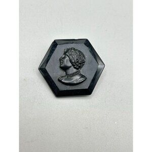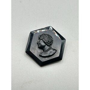 Tags: Vintage brooch, black cameo pin, glass cameo, cameo pin brooch, Antique jewelry, left facing, woman pin, mourning jewelry, Intricate detailing, Stylish brooch, Mourning pin, hexagon brooch, victorian brooch, costume jewelry