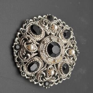 This is a beautiful vintage brooch featuring black glass stones, rhinestones, and faux pearls set in a silver-tone metal.