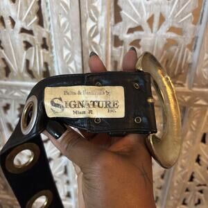 This Vintage Black Gold Grommets Old Money Soft Leather Belt with an Oversized Gold Buckle by Signature Inc is a timeless accessory that exudes a classic, tailored look from the 1970s. Made from high-quality leather in the United States, this belt is perfect for casual occasions and can be worn by adult unisex individuals who appreciate vintage style. The black color and intricate grommets add a touch of sophistication to any outfit, making it a must-have piece for those who love unique and special clothing accessories.