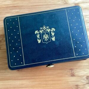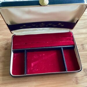 Vintage Black Gold Leather Red Velvet Men's Jewel Box Valet Station Travel Case. Perfect for cufflinks, rings, watches, ets. Secure tight closure. Approximately 8.5” x 6” x 2”.