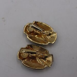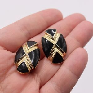 These vintage black and gold-tone clip-on earrings embody mid-century modern elegance with bold sculptural flair. The domed oval shape features a smooth black enamel center overlaid by a gold crisscross design, blending contrast and texture beautifully. Their metallic sheen and geometric form create a timeless statement look that channels 1980s glamour. Lightweight and comfortable, they pair effortlessly with both eveningwear and tailored looks, making them a versatile addition to any vintage jewelry collection. Perfect for collectors or anyone who loves retro statement accessories.