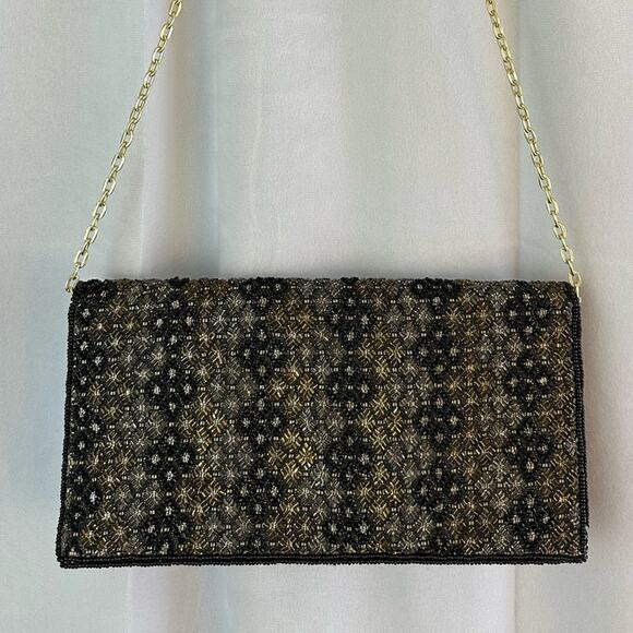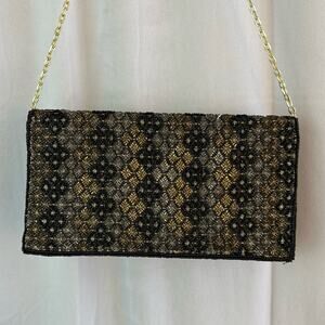 Vintage Black & Gold Walborg Hong Kong Beaded Purse. snap closure. gold chain strap. preowned with a couple loose beads shown in photos otherwise in good condition