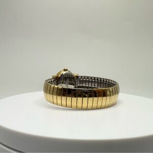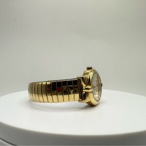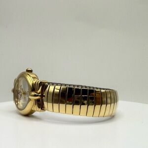 Elegant vintage Black Hills Gold women’s quartz wristwatch featuring genuine 12K gold leaves in classic rose, green, and yellow tones. Beautiful mother-of-pearl style dial with leaf accents and gold-tone case. Expandable gold-tone/stretch stainless steel band for a comfortable fit.