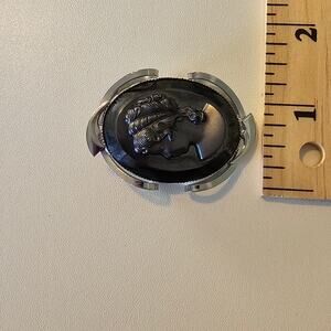 Beautiful and unique vintage cameo. Intaglio Cameo. Dark silver gray cameo. Silver abstract design surround. Oval shape.