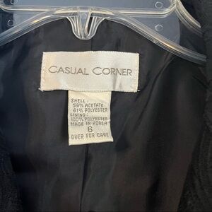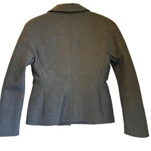 Elegant vintage blazer by Casual Corner in a textured black jacquard with tonal paisley pattern. Features a tailored fit with structured seams, a three-button front closure with faceted black buttons. Fully lined for structure and comfort. Made from a blend of acetate and polyester with a luxurious, formal finish, size 6.