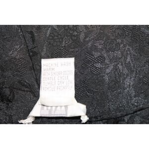 Minimalist black jacquard slip dress with subtle floral texture. Features a V-neck front and back with a flowy silhouette. A classic 1990s-early 2000s department store piece with timeless styling.