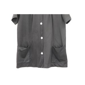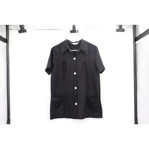 This blouse is plain black. It has button front and pockets. It is a rayon polyester blend. It is probably around a size medium large. 19 p2p 28 length