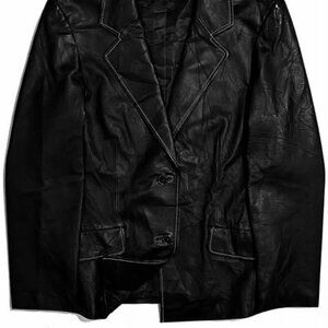 Material: Lightly glossy washed lambskin leather Size: M (Length: 67 cm; Chest Width: 49 cm) This black leather blazer features a subtle shine and may appear slightly different in color due to lighting. It is detailed with cream-colored stitching that adds a stylish highlight. The blazer has light shoulder padding and a soft, supple inner lining, designed for a flattering fit with a beautiful waistline, suitable for both men and women. If you have any questions or need more information, feel free to ask!