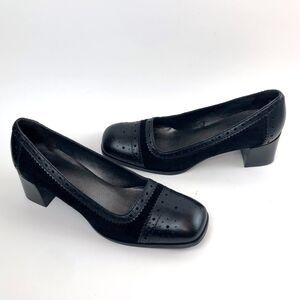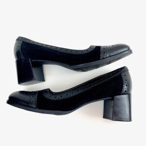 Timeless vintage black chunky heel Women's pumps with brogue detailing. Versatile for office, dressing up or your favorite jeans. .