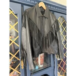 vintage leather fringe jacket, black cowgirl jacket medium, western biker jacket, rodeo leather fringe, real leather fringe coat, edgy moto jacket, 90s fringe jacket, cowgirl concert outfit, vintage boho western jacket, womens leather fringe jacket M
