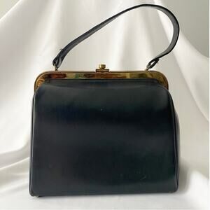 Elevate your style with this vintage black leather handbag, featuring a structured design and a classic top handle. The elegant metal clasp and subtle gold-tone ring accent add timeless sophistication to this retro piece. Perfect for formal occasions or as a stylish everyday accessory, this handbag is a versatile staple for any vintage lover.