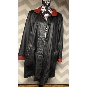 Vintage Black Leather Long Woman’s Jacket Red Lining Kircilar Lg Preppy Princes