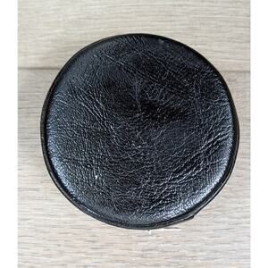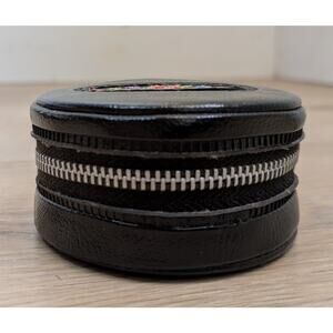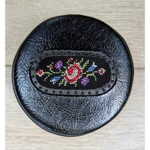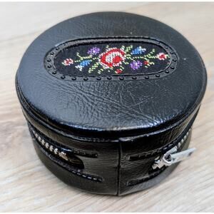 Vintage Black Leather Mini Zippered Round Sewing Kit Embroidered Floral 3"