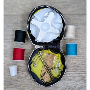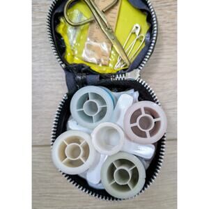 All contents are unused and include 4 spools of thread, 2 safety pins, sewing needles, brass scissors and a paper measuring tape.