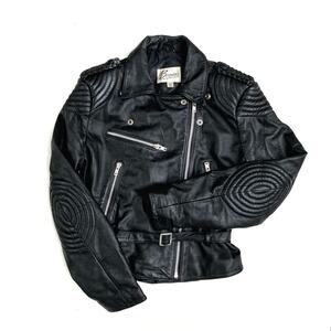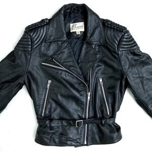 The ultimate cool-girl layer. Vintage Berman’s black leather moto jacket with sculpted quilting at shoulders and elbows, braided epaulette detail, silver zippers, and a belted waist. Fully lined and lightly insulated for warmth and that structured, lived-in feel. Classic asymmetrical zip front and zip cuffs add instant polish and style.