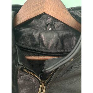 black leather jacket, motorcycle jacket, vintage biker jacket, lace-up jacket, classic moto jacket, medium jacket, biker style coat, durable leather wear, black outerwear, zippered leather coat, functional zippers jacket, vintage style clothing, adjustable leather jacket