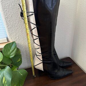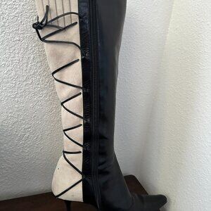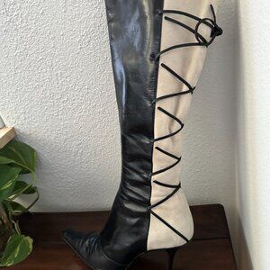 Vintage Black Leather White/Cream Suede w/Lace Detail Stiletto Boots 8.5