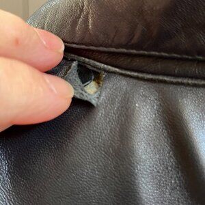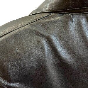 This jacket has several issues, several small holes and a tear at the shoulder seam. Some discoloration or missing dye on the right arm. Buttons covered in leather have some knicks