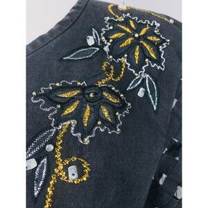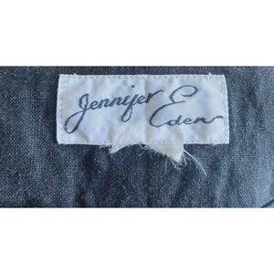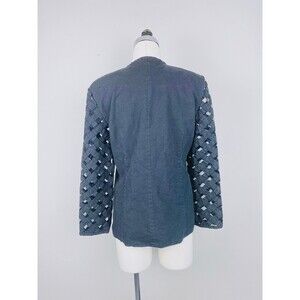 Love this jacket and I cannot lie! By Jennifer Eden this jacket looks as entrancing as the name of its designer. Beautiful black linen is is so luscious and wonderful. Slim cut with gold threaded floral appliques on the collar bones. Incredible basket weave sheer sleeves give this a rock and roll edge. Button closure.
