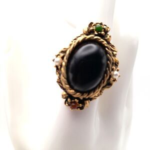 *Description: This vintage brass ring features a striking black Lucite cabochon as its main stone, shaped in an oval design. The ring is adjustable to size 7, making it a versatile piece for women. It also includes faux pearl secondary stones to add a touch of elegance to the cocktail style ring. There is also a red and green bead on the top of each end. The unique combination of materials like Lucite and brass gives this vintage piece a timeless and fashionable appeal with a distressed look, perfect for those who appreciate retro jewelry with a modern twist.