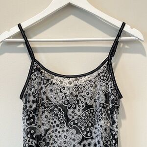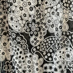 Features: paisley vintage 70s/80s print, adjustable straps, sheer mesh, long length, back slit, black and white