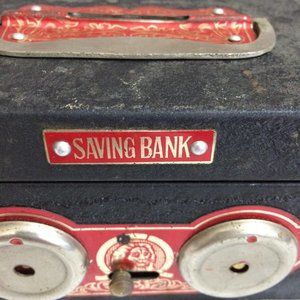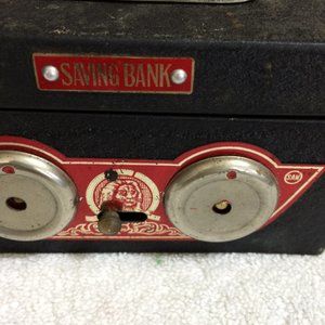 Vintage Black Metal Savings Bank SAN Lion Handle Coin Slot Good Condition